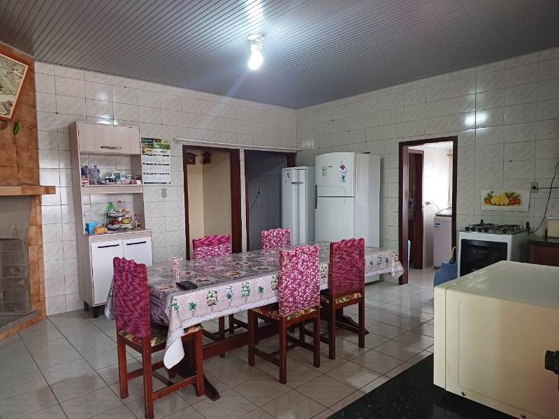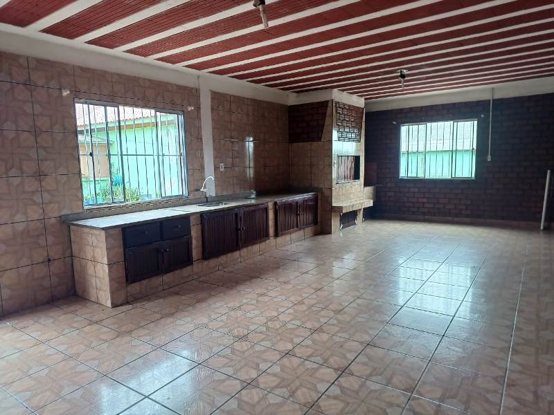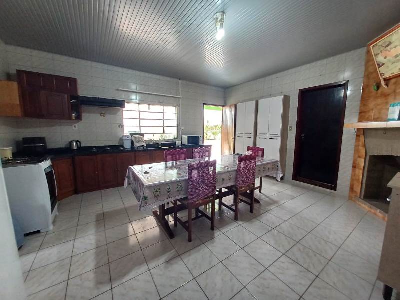 * Cozinha com pia, armário aéreo e lareira;